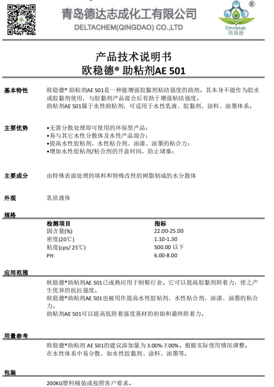 我司顺应未来市场的发展趋势,率先推出OMNISTAB AE501水性助粘剂。OMNISTAB AE 501是一款专门用于水性胶黏剂的助粘剂,它是一种由特殊表面处理的填料和特殊改性的树脂制成的水分散体,具有如下的特点: