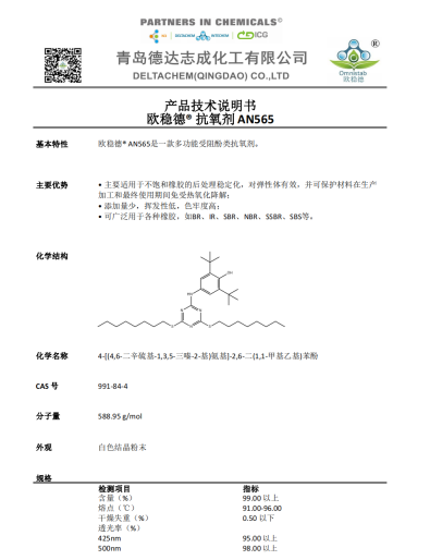 OMNISTAB® AN565就是一款高分子量的多功能受阻酚抗氧剂,具有相容性强、毒性低、色泽污染小的特点,且自身兼具主、辅抗氧剂的双重功效,能产生分子内协同,又能与其他抗氧剂复配产生共混协同作用,抗氧化效果好。是多种树脂优良抗氧化剂和光热稳定剂。主要适用于不饱和橡胶的后加工稳定处理,能保护材料在生产,加工和最终使用过程中不发生热氧化降解。