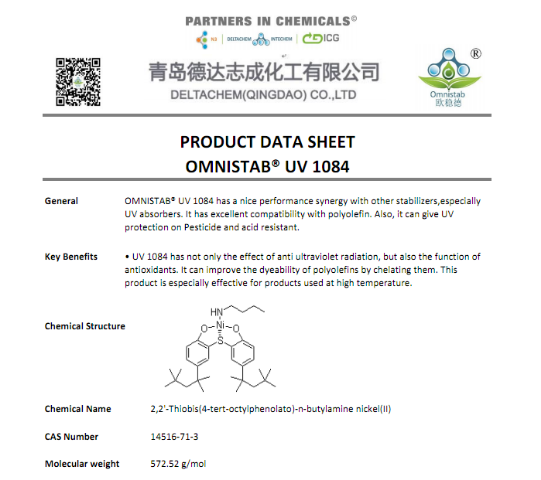 紫外线吸收剂 UV-1084,中文别名为2,2-硫代双(4-叔辛基苯酚)正丁胺镍盐;(1-丁胺)[[2,2-(硫-KS)二[4-(1,1,3,3,-四甲基丁基)苯酚根合-KO]](2-)]镍。