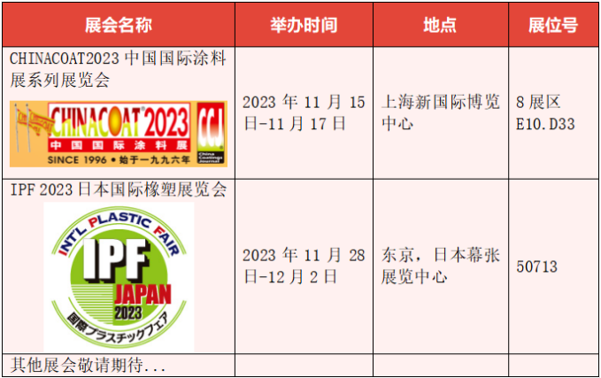 德达特化集团2023年Q4后续参展计划如下,欢迎各位行业同仁们莅临参观!