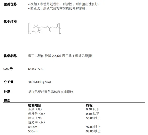 欧稳德® LS622是一种低聚物高分子量受阻胺光稳定剂,是光稳定剂市场的主流产品,是农膜用光隐定剂的支柱产品。欧稳德® LS622具有优良的加工热稳定性,优秀的长效抗光老化性,很低的挥发性和耐迁移、耐萃取、耐气体褪色等特点,广泛用于聚烯烃及其共聚物,还可用于聚酰胺、聚氨酯(纤维、热熔胶等)。它是一种高效光稳定剂,特别在含颜料体系其效果超过紫外线吸收剂,并且还不会影响产品体系的颜色。它与紫外线吸收剂或其他HALS并用时可产生良好的协同效应。