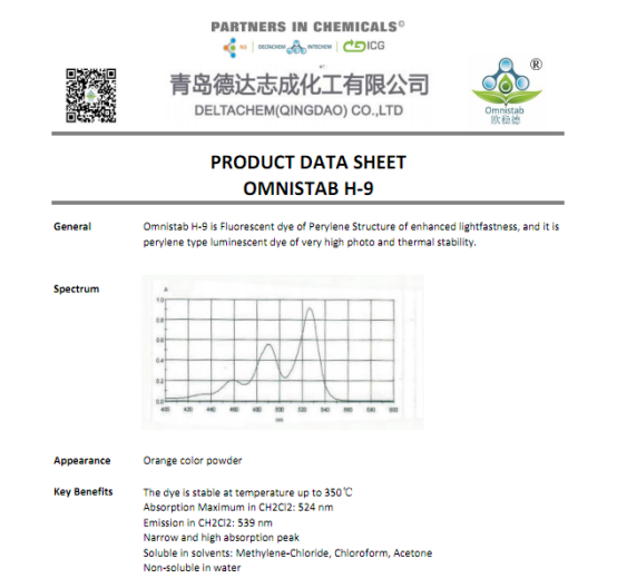 OMNISTAB H-9属于荧光染料,其主要用途是光转化的可能性,最大的吸收波长为524nm,在氯仿中最大荧光波长为539nm,转换率高达90%。该染料可用于聚合物基体,如PC, PMMA, 环氧树脂等,也可用做涂料添加剂。但是与PA、PU、聚烯烃不相容。基于其荧光特性,也可应用于LED生产,太阳能聚光器等应用中。OMNISTAB H-9在二氯甲烷、氯仿、丙酮中有极好的溶解性,同时具有良好的耐光性,适合各类塑料、涂料、油墨、薄膜、防伪等产品的应用。