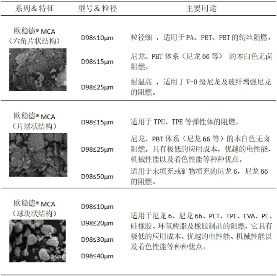 三聚氰胺氰尿酸盐MCA阻燃剂阻燃性能与其晶体形态和粒径有非常紧密的关系。经过产线升级,我司目前可以生产三种不同晶型的MCA产品,同时每种晶型对应不同粒径的产品,满足更多客户不同应用场景。