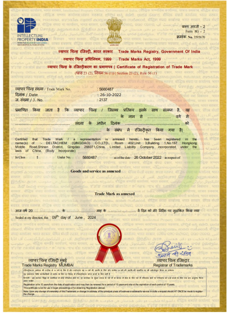 印度商标注册的成功,是青岛德达特化集团全球化品牌战略的重要一步,更是我们未来发展的新起点。我们将以此为契机,继续加大研发投入,提升产品质量,优化服务体系,以更加卓越的产品和更加专业的服务回馈广大客户。