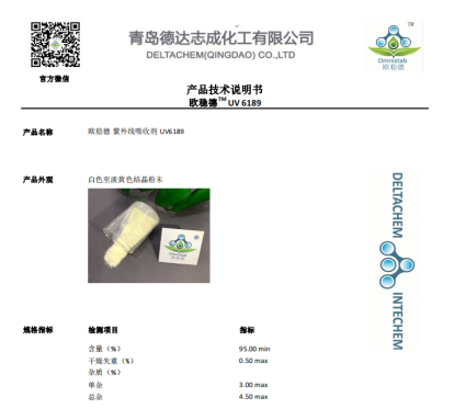 欧稳德紫外线吸收剂UV6189我司已生产和销售多年,产品在国内和国外均有销售,凭借稳定的产品供应和优质的产品服务已经获得了广大客户的认可与好评。如果有关于该产品的任何使用或技术方面问题,欢迎随时与我们沟通交流,我们有专业的技术团队可以提供产品解决及优化方案。
