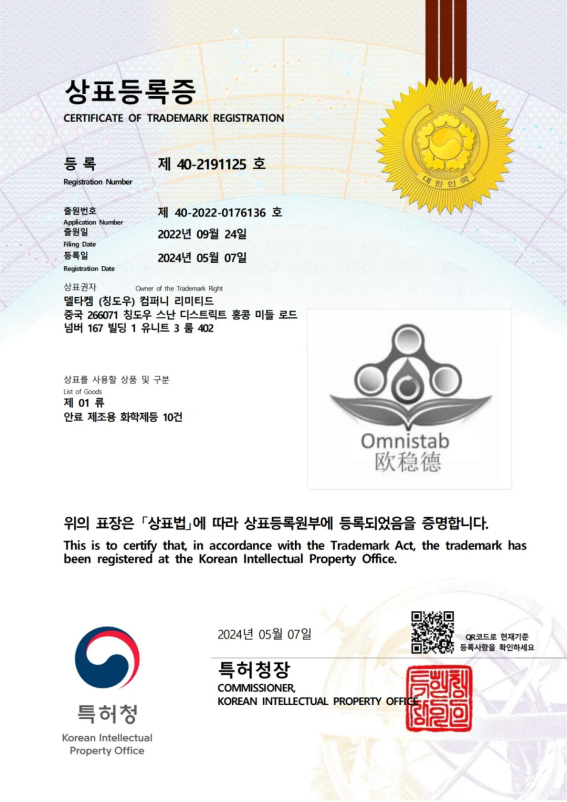 2024年5月7日,青岛德达特化集团顺利完成“欧稳德OMNISTAB”商标在韩国地区的注册。目前,商标已通过韩国知识产权局核准,并成功获得“商标注册证书”,证书有效期为2024年5月7日至2034年5月7日。