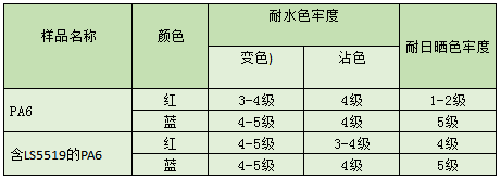 对于红、蓝、黄的染色的色牢度,含LS5519的PA6比不含LS5519的尼龙产品都提高了4 K/S以上,其中蓝色的色牢度提高了8.7 K/S,可以认为LS5519显著提高了尼龙产品的染色深度,说明LS5519可以提高颜料着色力,增强尼龙纤维的可染性,增强染色性能,从而提高染料的使用效率,进而降低成本。