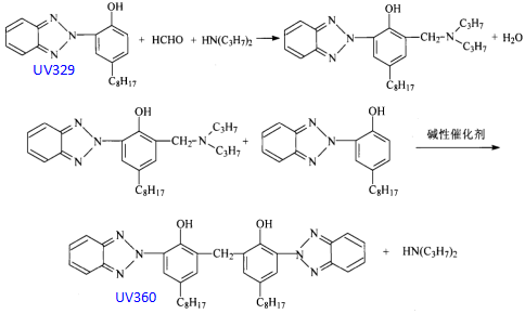 以上反应被称作Mannich反应,即两分子UV329与甲醛、仲胺在碱催化作用下进行缩合反应得到UV360分子。UV360在200℃时热失重为0.5%,300℃时热失重为1.8%,即在200-300℃范围内,UV360基本没有热失重。分子量的提高使得UV360具有良好的光稳定性和热稳定性,即使在长期暴晒下其吸收能力也不降低,且在加工和使用时不因受热而变化。