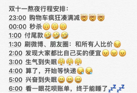 以下是一位网友分享的“双十一”熬夜行程表 ↓↓